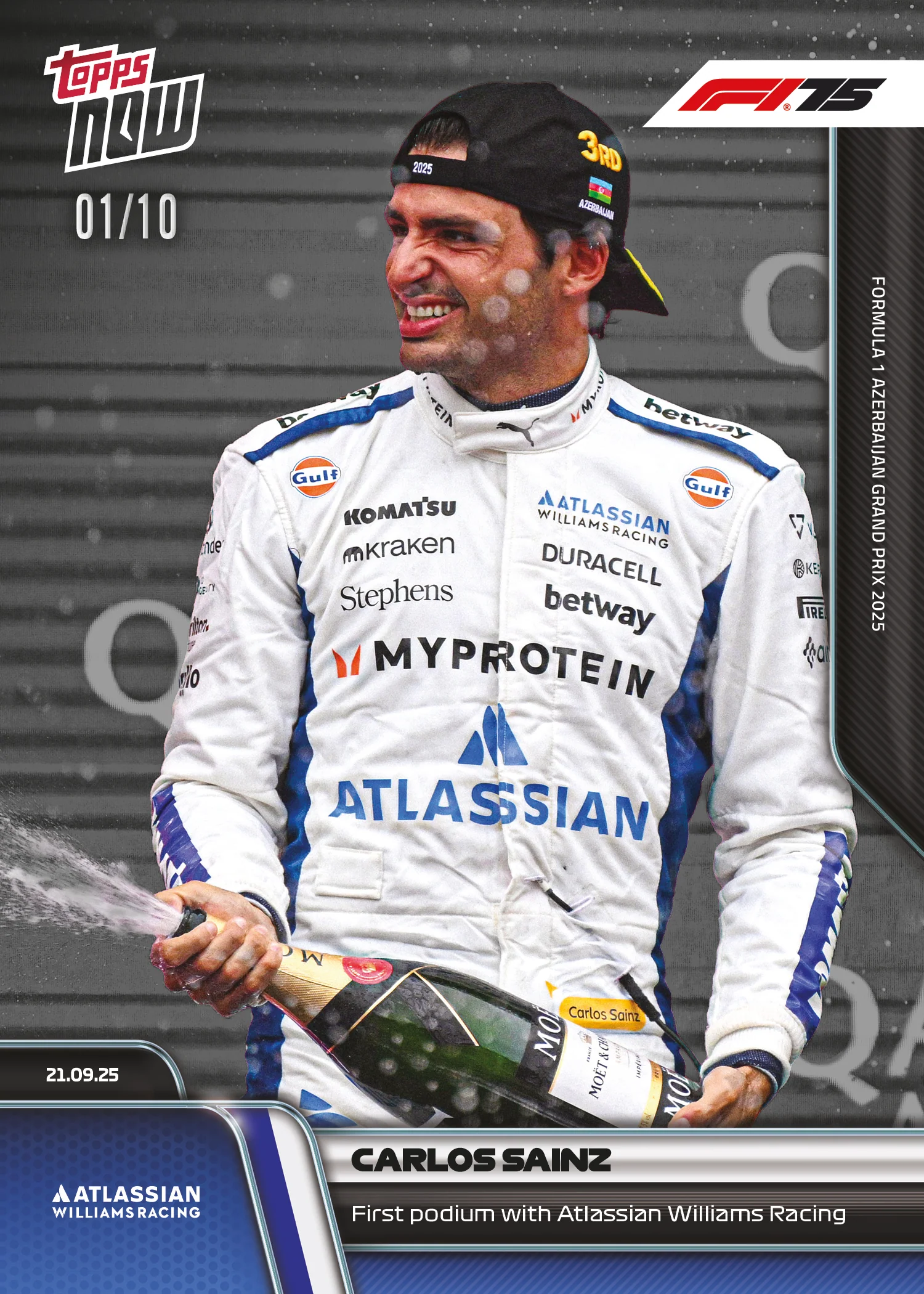 Carlos Sainz secured his first Podium for Atlassian Williams Racing with an impressive P3 finish at the FORMULA 1 AZERBAIJAN GRAND PRIX 2025.The Spaniard had a Weekend to remember at the Baku City Circuit as he produced an exceptional qualifying display(P2) and race to earn himself a place on the podium. His P3 finish was his first Podium with Atlassian Williams Racing and the team's first full-race Podium since the FORMULA 1 AZERBAIJAN GRAND PRIX 2017. A huge result for everyone involved and one to build on for the remainder of the season.