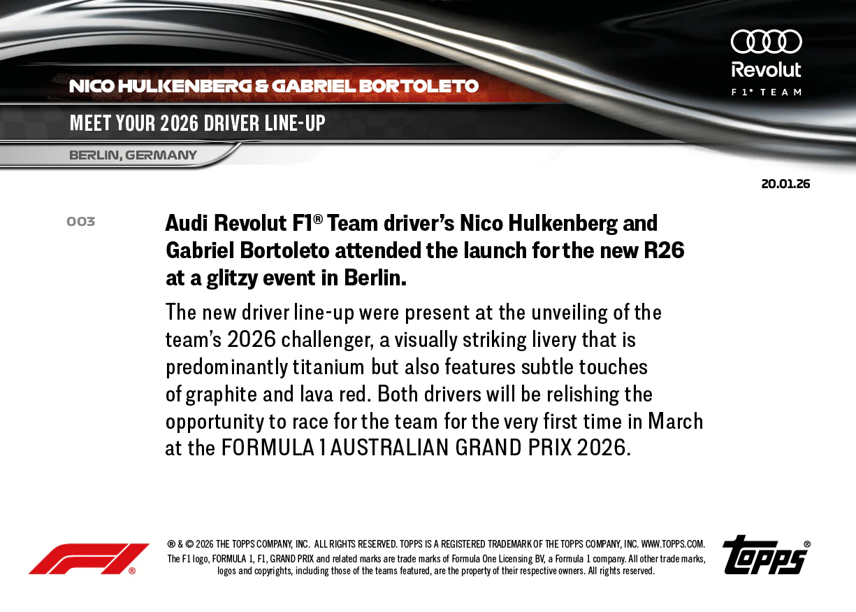 Audi Revolut 1® Team driver's Nico Hulkenberg and Gabriel Bortoleto attended the launch for the new R26 at a glitzy event in Berlin.The new driver line-up were present at the unveiling of the eam's 2026 challenger, a visually striking livery that is predominantly itanium but also Features subtle touches of Graphite and Lava red. Both drivers will be relishing the opportunity to race for the Team for the very first time in March at the FORMULA 1 AUSTRALIAN GRAND PRIX 2026.