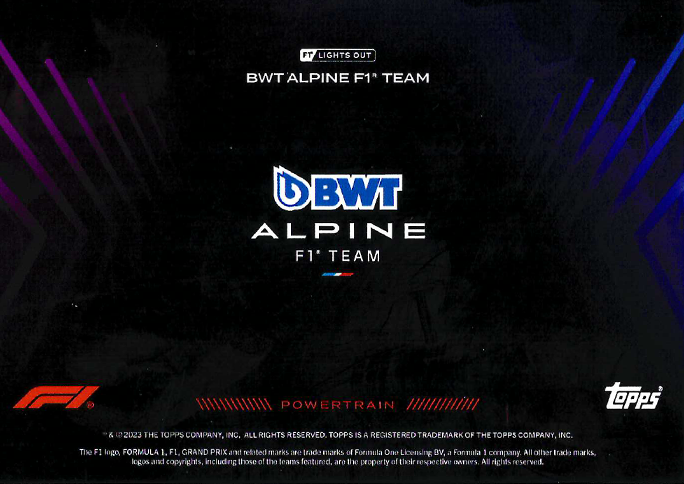 Limitiert: Nein Anzahl: 1 Favorit: nein Bereich: Base card Typ: Powertrain Sprache / Version: Englisch / Europa Verkauft / getauscht: nein Team: Alpine(F1) Schätzpreis: 1.50 € Produkt: Formula 1 Lights Out 2022