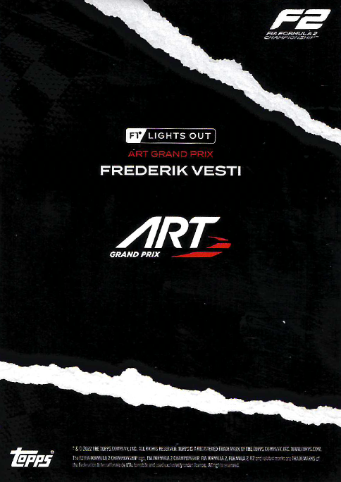 Limitiert: Nein Anzahl: 1 Favorit: nein Bereich: Base card Typ: F2 Drivers Sprache / Version: Englisch / Europa Verkauft / getauscht: nein Team: ART Grand Prix(F2) Schätzpreis: 1.50 € Produkt: Formula 1 Lights Out 2022